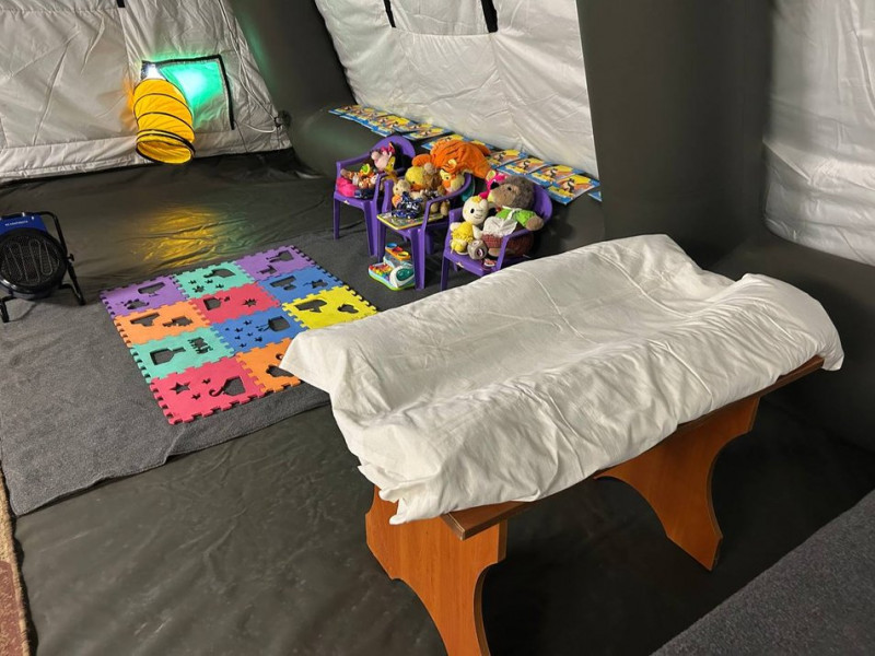 Дитячий куточок та сповивальний столик у мобільному пункті незламності в середмісті Хмельницького, 11 січня 2026 року. Суспільне Хмельницький
