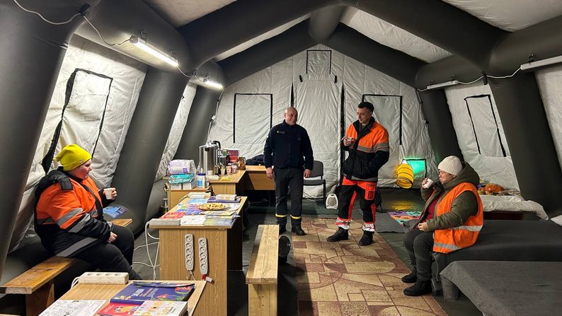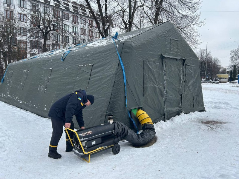 Черговий пункту, командир відділення ДСНС у Хмельницькій області Олексій Оленич зазначив, намет обігрівається компресором — нагнітачем повітря, що нагріває і подає тепло в намет.