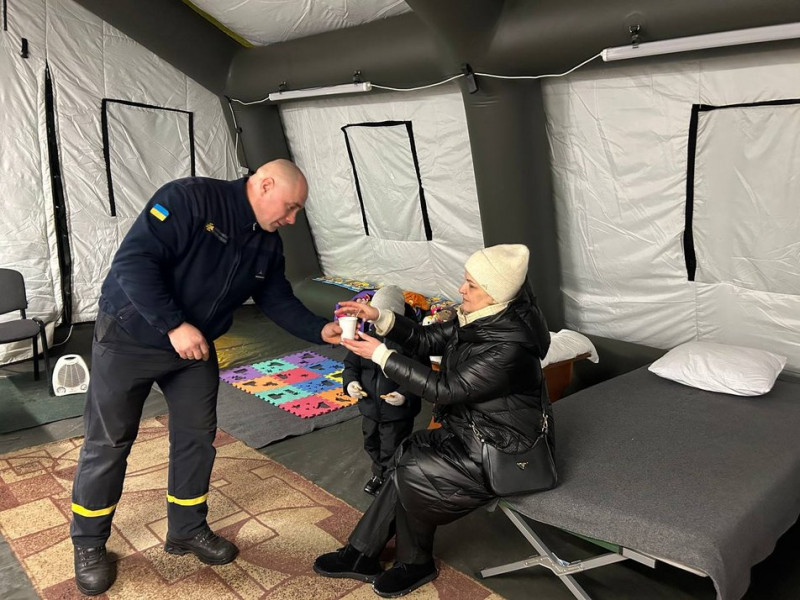 Працівник ДСНС пригощає чаєм відвідувачку пункту обігріву Ірину, яка прийшла до намету з онуком, Хмельницький, 11 січня 2026 року. Суспільне Хмельницький