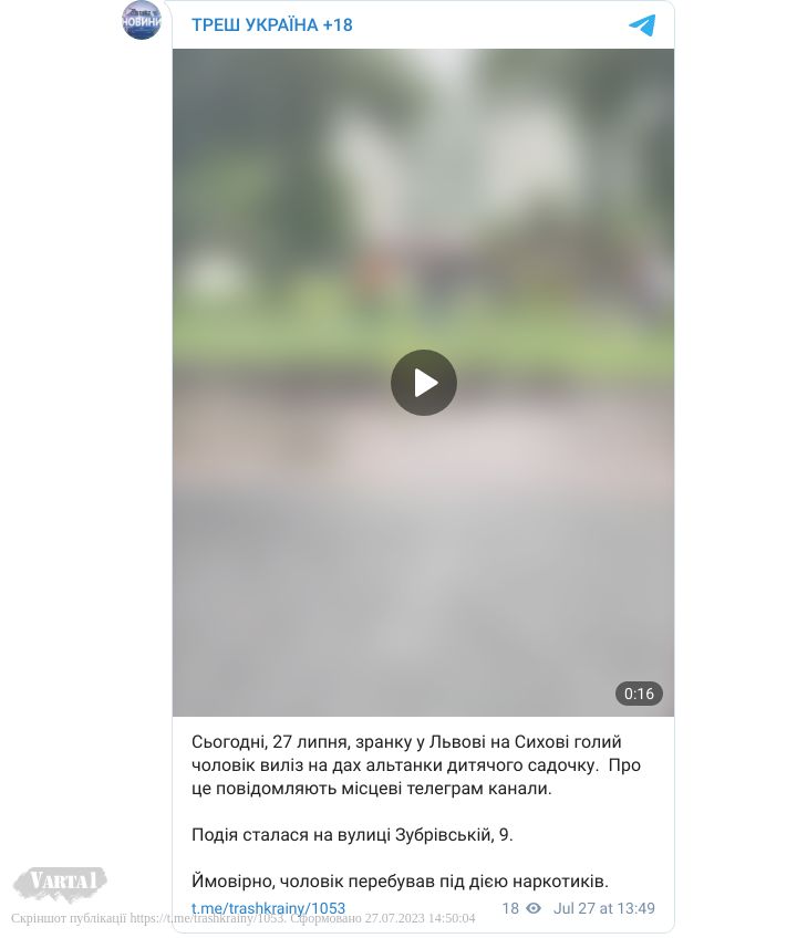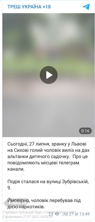 Сьогодні, 27 липня, зранку у Львові на Сихові голий чоловік виліз на дах альтанки дитячого садочку. Про це повідомляють місцеві телеграм канали.