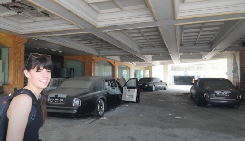 Перед головним входом і досі стоять три Rolls-Royce Phantom із подовженою колісною базою. Незважаючи на розбиті вікна будівлі та графіті навколо, автомобілі збереглися відносно добре. Поруч знаходяться старий Mercedes-Benz S-Class, вкритий товстим шаром пилу, і кілька мікроавтобусів Toyota Alphard, які, ймовірно, перевозили гостей готелю.