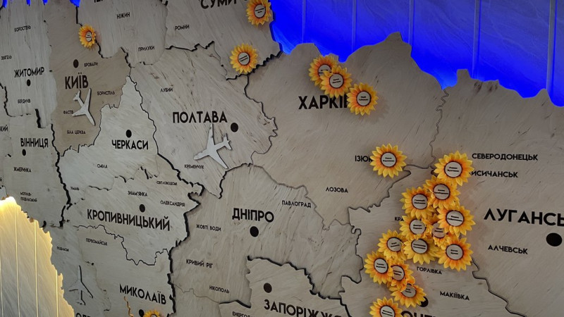 Фігурки соняхів прикріплюють на мапу тих областей, де загинули військові. Суспільне Полтава