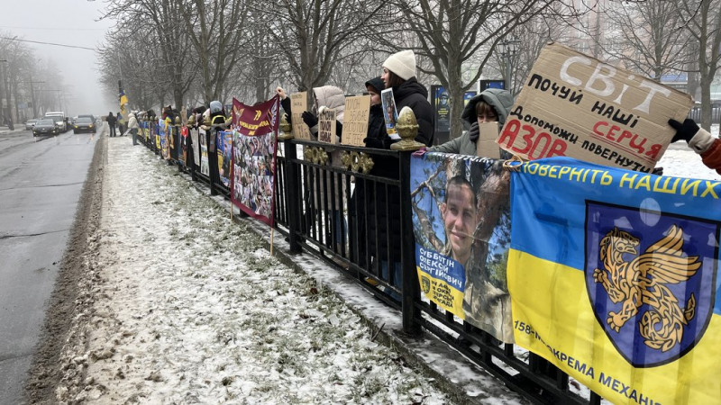 Люди вишикувалися обабіч алеї, уздовж вулиці Соборності. Принесли із собою прапори підрозділів, фото їхніх рідних та плакати із написами: "Де Азов?", "Будь їх голосом", "Світ мусить кричати, щоб побачили їх". Також присутні закликали водіїв, які проїжджають повз, сигналити і таким чином показувати свою підтримку.