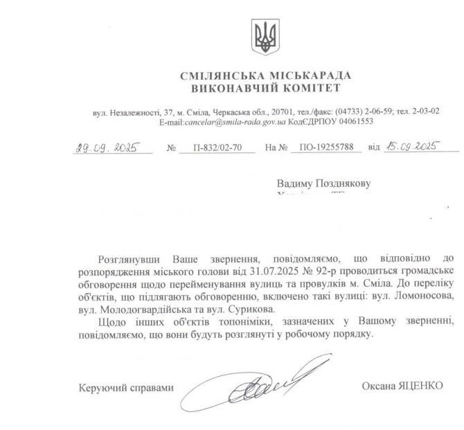 У місті Сміла до перейменування готують ще 3 вулиці.