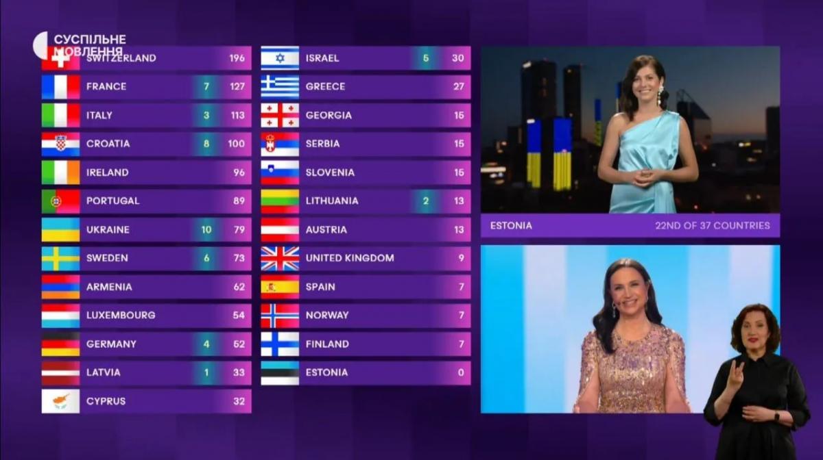 01:20 – Речниця Естонії вийшла на звʼязок на тлі підсвічених українським стягом багатоповерхівок. Україна отримала 10 балів.