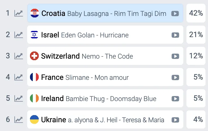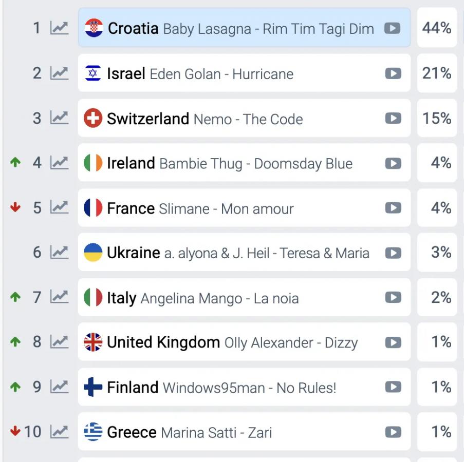 23:58 – “З ноги” на сцену ввірвався абсолютний фаворит букмекерів, головний претендент на перемогу в цьогорічному шоу – Baby Lasagna з Хорватії. Рок-перформанс, заїдаючий мотив, фаєршоу та трендові танці можуть забезпечити артисту якщо не лідерство, то місце в топ-3. Підспівував абсолютно весь зал.