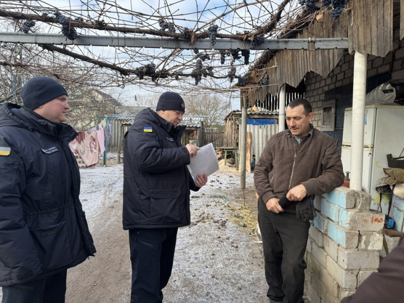 Офіцер-рятувальник громади Сергій із поліцейським та старостою обходять житлові будинки. Суспільне Полтава