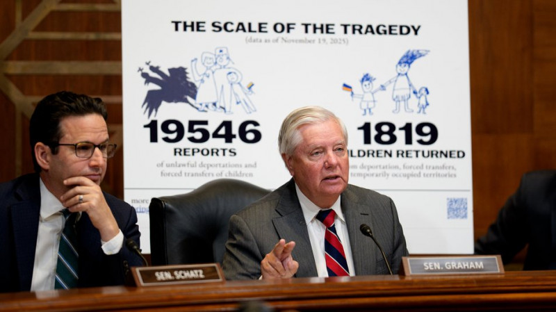 Голова Сенату, республіканець Ліндсі Грем виступає на тлі плаката з написом “Масштаби трагедії” під час слухань підкомітету Сенату з питань асигнувань на тему “Викрадення українських дітей Російською Федерацією”, Вашингтон, США, 3 грудня 2025 року. Getty Images/Andrew Harnik
