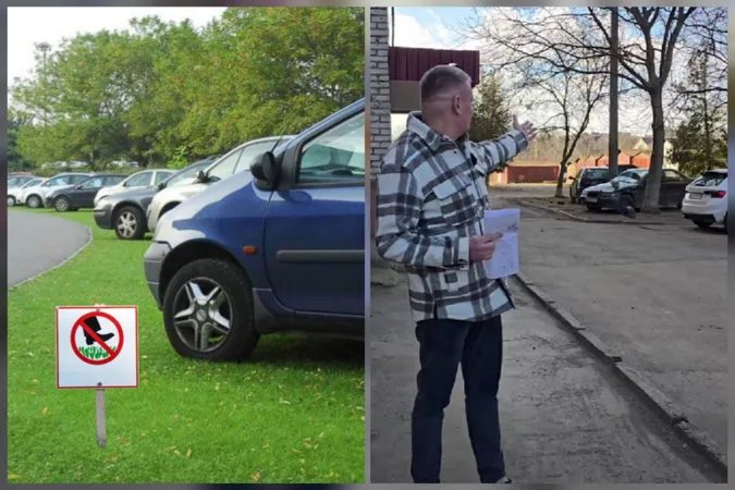 На відео видно, що у дворі засилля автівок, які не мають достатньо місця для парковки. Дехто залишає власний транспорт на газонах, між деревами. Покриття прибудинкової території частково зруйноване.