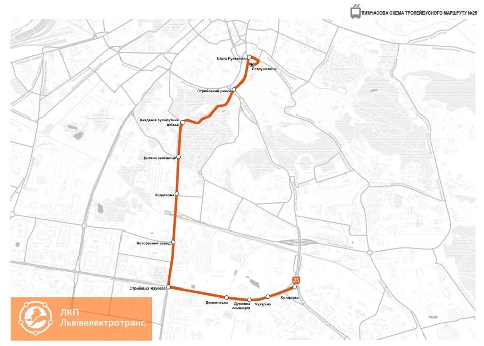 Тролейбуси №25 курсуватимуть з вул. Шота Руставелі також до перехрестя проспектів Івана Павла ІІ та Червоної Калини (зупинка «Хуторівка») та в зворотному напрямі.