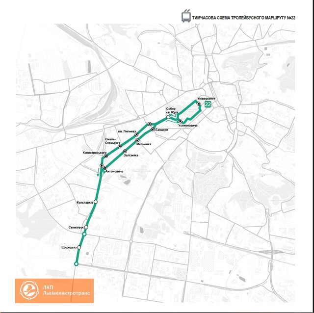 Так, тролейбуси №22 курсуватимуть за скороченим маршрутом – від Університету до ТРЦ «Вікторія Гарденс» та в зворотному напрямі.
