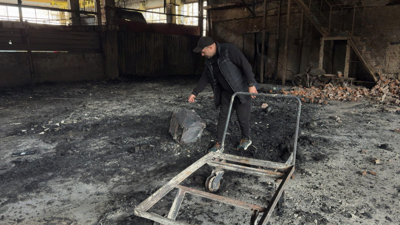 Олександр Карасьов оглядає пошкоджене приміщення, квітень 2026 року. Суспільне Хмельницький