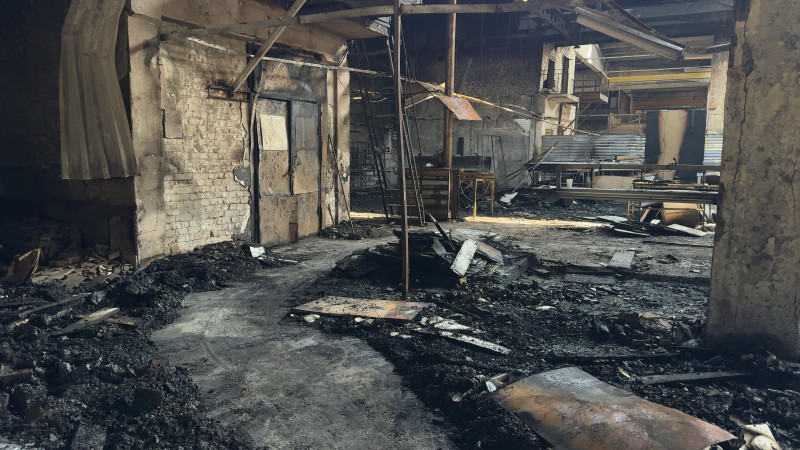 Пошкоджене майно та залишки обладнання всередині вигорілої будівлі, Хмельницький, квітень 2026 року. Суспільне Хмельницький
