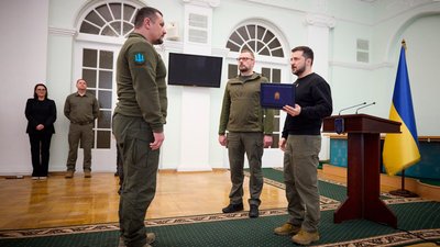 Президент України Володимир Зеленський під час робочої поїздки на Чернігівщину 3 квітня передав начальнику Чернігівської міської військової адміністрації Дмитру Брижинському відзнаку "Місто-герой України Чернігів". Нагадаємо, звання міста-героя Чернігів отримав 6 березня 2022 року.