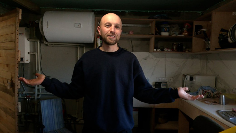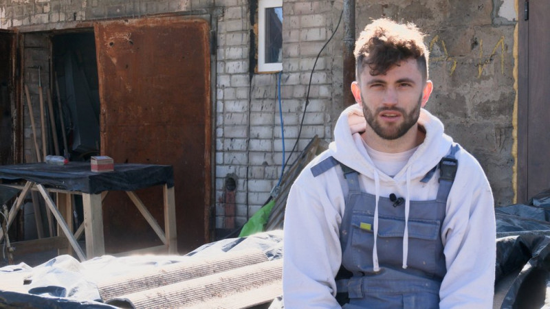 Сергій Кураксін, режисер за фахом, разом із друзями-волонтерами допомагав будувати будинок. Раніше на цьому місці стояв сарай із льохом, де в перші дні широкомасштабної війни ховалися 32 людини, у тому ж таки підвалі приймали пологи.